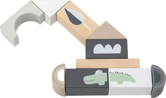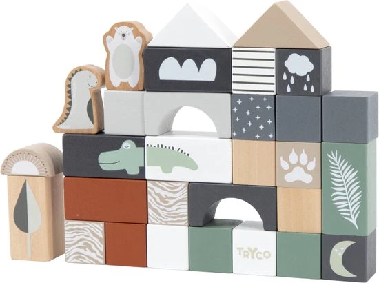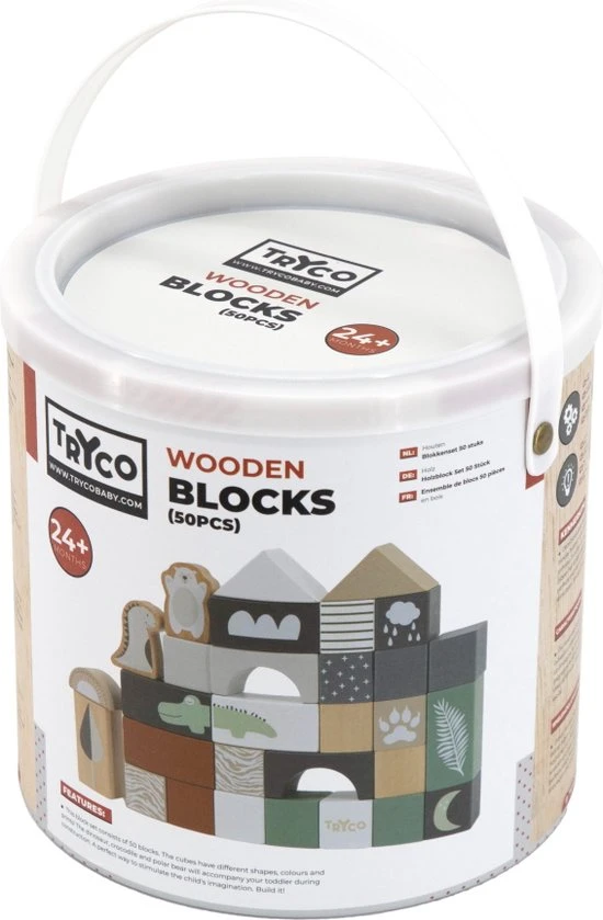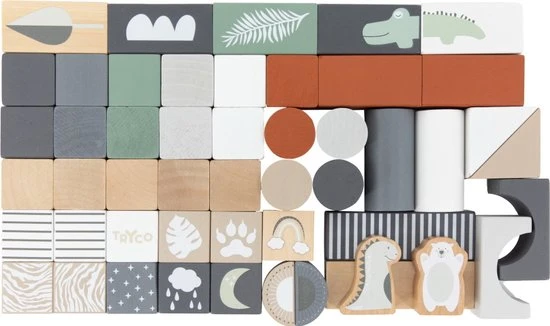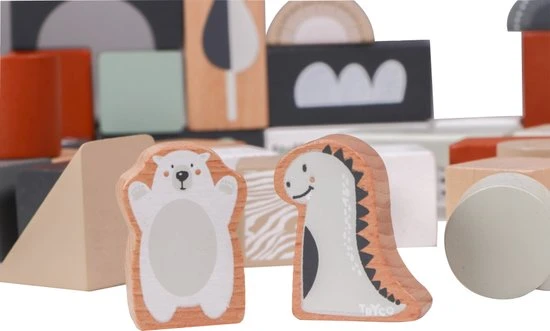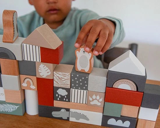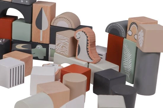 Deze blokkenset bestaat uit 50 stuks blokken. De blokjes zijn gemaakt van degelijk hout en hebben verschillende vormen, kleuren én printjes! Zo zullen de o.a. de dinosaurus, krokodil en ijsbeer het kindje vergezellen tijdens het bouwen.