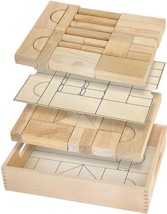 Een mooi afgewerkte blokkenkist met 46 grote blokken. Zowel kist als blokken zijn gemaakt van beukenhout. De kistmaten zijn 39x29x7,8cm en grootste blokmaten zijn 13,2×6,6×3,3cm en 26,4×3,3×3,3cm. De basisblokmaat is 3,3cm. Op de bodem van de kist is met een duidelijke print aangegeven waar de blokken van de 1e laag teruggelegd moeten worden en op ’n triplex tussenplaat is met ’n print aangegeven waar de blokken v.d. 2e laag teruggelegd moeten worden. Heel handig om de blokken na het spelen weer vlot in de kist terug te doen en tevens een leuke puzzel voor uw kind om alle blokken weer netjes op juiste plaats in de kist terug te leggen. Het totaal gewicht v.d. kist met blokken is 5,5kg.
