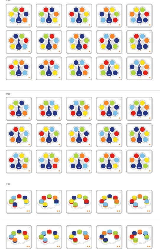 Dit Peacock Color Matching-spel bevat 4 pauwborden, 2 zeven, 36 houtsnippers in 6 kleuren en 20 dubbelzijdige spelkaarten. Kinderen kunnen de overeenkomstige gekleurde houtsnippers op de pauwplint leggen volgens de instructies van de spelkaart, die het vermogen van de kinderen om afbeeldingen te lezen en kleurherkenning test. Ze kunnen ook concurreren met hun vrienden: elk met een speelkaart en houten fiches in de pauw plaatsen volgens de kleur van de dobbelstenen. De speler die als eerste het patroon op de kaart voltooit, wint. Geweldig voor het verbeteren van de kleurherkenning, hand-oogcoördinatie en snelle reflexen van kinderen.”