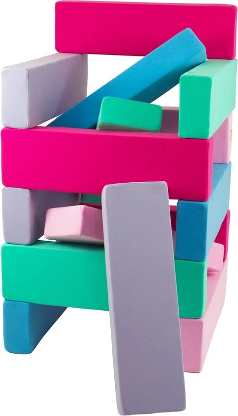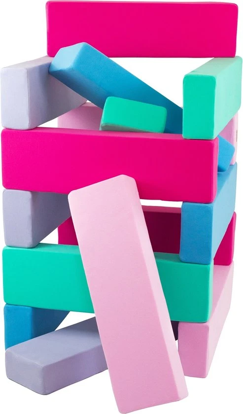 De bouwstenenset “Jenga” van Velinda bestaat uit 15 kleurrijke bouwstenen van schuim.