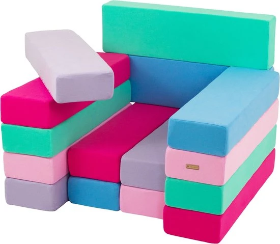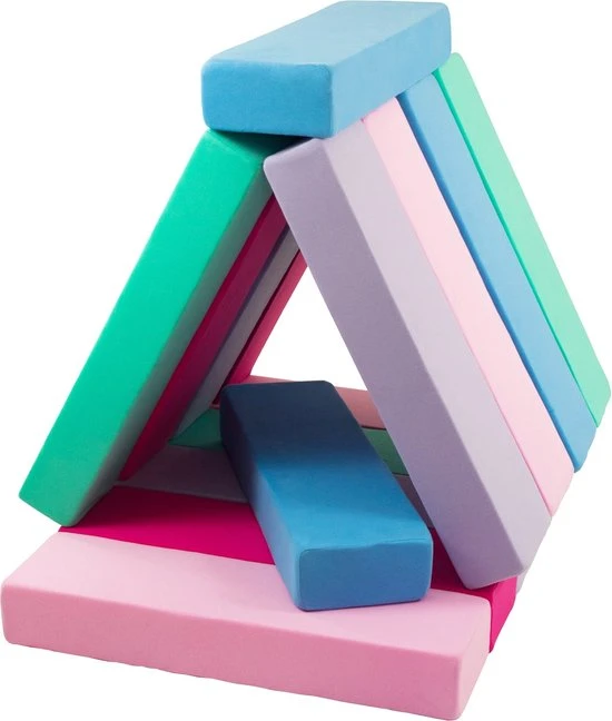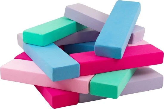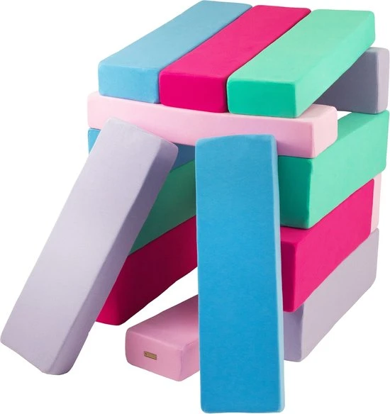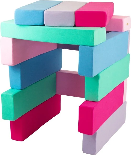 Stijlvolle schuimen bouwblokken met blauwe, roze, lichtroze, paarse, turqouise kleuren van Vikingchoice. Deze blokkenset bestaat uit meerdere elementen en kun je daardoor configureren in meerdere vormen.